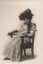 | Keywords: portraits women monochrome Photographer: Reuben R. Sallows (1855 - 1937) Description: Studio portrait of young woman seated in arm chair; wearing light-coloured dress with dark flocking, large dark hat, long black leather gloves and ornate bracelet on right arm; one dark shoe visible at right; plain white backdrop; Sallows imprint on lower right corner; photo encased in dark grey folio, lined with thin sheet of spider-web textured paper, folio has swastika in upper left corner of cover; (Museum notes identify subject as Florence Sallows) Object ID : 0353-rrs-ogohc-ph View additional photographs by Sallows that are held in other collections at the Reuben R. Sallows Digital Library. Order a higher-quality version of this item by contacting the Huron County Museum (fee applies). Photographer: Reuben R. Sallows (1855 - 1937) Description: Studio portrait of young woman seated in arm chair; wearing light-coloured dress with dark flocking, large dark hat, long black leather gloves and ornate bracelet on right arm; one dark shoe visible at right; plain white backdrop; Sallows imprint on lower right corner; photo encased in dark grey folio, lined with thin sheet of spider-web textured paper, folio has swastika in upper left corner of cover; (Museum notes identify subject as Florence Sallows) Object ID : 0353-rrs-ogohc-ph View additional photographs by Sallows that are held in other collections at the Reuben R. Sallows Digital Library. Order a higher-quality version of this item by contacting the Huron County Museum (fee applies). |