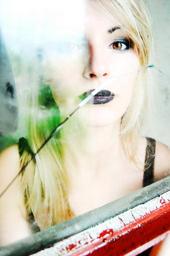 Keywords: portrait face blonde macke up the glass the brocken eyes the black lips lipstick sad serious wonat woman person