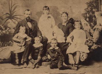 | Keywords: children group portraits groupportraits women groupshot people monochrome Photographer: Reuben R. Sallows (1855 - 1937) Description: Studio portrait of family of two adults and six children; parents seated in back with elder girl standing between; mother wearing dress with high lace collar holds infant; father wears dark suit, vest, white shirt, pocket watch chain, trimmed beard hides tie; two small boys in dark suits sit in foreground; painted backdrop; Sallows imprint on back; writing on back provides date taken in 1884 in the fall, Mother born October 1847, Father born 1842, Mother 37 years, Father 42, me about 3 Object ID : 0443-rrs-ogohc-ph View additional photographs by Sallows that are held in other collections at the Reuben R. Sallows Digital Library. Order a higher-quality version of this item by contacting the Huron County Museum (fee applies). Photographer: Reuben R. Sallows (1855 - 1937) Description: Studio portrait of family of two adults and six children; parents seated in back with elder girl standing between; mother wearing dress with high lace collar holds infant; father wears dark suit, vest, white shirt, pocket watch chain, trimmed beard hides tie; two small boys in dark suits sit in foreground; painted backdrop; Sallows imprint on back; writing on back provides date taken in 1884 in the fall, Mother born October 1847, Father born 1842, Mother 37 years, Father 42, me about 3 Object ID : 0443-rrs-ogohc-ph View additional photographs by Sallows that are held in other collections at the Reuben R. Sallows Digital Library. Order a higher-quality version of this item by contacting the Huron County Museum (fee applies). |