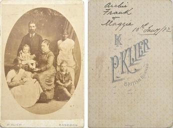| Keywords: dickson archie dickson archiedickson frank dickson frankdickson maggie dickson maggiedickson 1882 cabinet card cabinetcard inscription dated public domain publicdomain indoor It seems clear that Archie and Frank here are the same children named with the surname Dickson on other photographs in this album. This is the only appearance of "Maggie", so perhaps she died in infancy? The other thing that intrigues me about this photograph is that it is the ony one which shows, I presume, the Dickson parents. From the 1891 Scottish census only the mother is recorded? Was he still in Burmah? For a summary of all the information and images I have gathered relating to the Dickson family see www.whatsthatpicture.com/2011/01/dickson-siblings --- One of 140 images from a fascinating album. For more information see the full set Just how many of these images can we identify, and what can we find out about the people they portray? It seems clear that Archie and Frank here are the same children named with the surname Dickson on other photographs in this album. This is the only appearance of "Maggie", so perhaps she died in infancy? The other thing that intrigues me about this photograph is that it is the ony one which shows, I presume, the Dickson parents. From the 1891 Scottish census only the mother is recorded? Was he still in Burmah? For a summary of all the information and images I have gathered relating to the Dickson family see www.whatsthatpicture.com/2011/01/dickson-siblings --- One of 140 images from a fascinating album. For more information see the full set Just how many of these images can we identify, and what can we find out about the people they portray? |