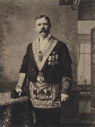 | Keywords: portraits people Photographer: Reuben R. Sallows (1855 - 1937) Description: Portrait of middle-aged man, three-quarter length, standing, facing front; wears black jacket and pants, white formal shirt; chain, cuffs and apron of office for Masonic Lodge; dark hair, handlebar moustache; left hand holds gavel resting atop covered table; archway leading to narrow window in background on right; Sallows imprint in lower left corner of matte; writing across bottom identifies subject: Major Joseph Beck Object ID : 0518-rrs-ogohc-ph View additional photographs by Sallows that are held in other collections at the Reuben R. Sallows Digital Library. Order a higher-quality version of this item by contacting the Huron County Museum (fee applies). Photographer: Reuben R. Sallows (1855 - 1937) Description: Portrait of middle-aged man, three-quarter length, standing, facing front; wears black jacket and pants, white formal shirt; chain, cuffs and apron of office for Masonic Lodge; dark hair, handlebar moustache; left hand holds gavel resting atop covered table; archway leading to narrow window in background on right; Sallows imprint in lower left corner of matte; writing across bottom identifies subject: Major Joseph Beck Object ID : 0518-rrs-ogohc-ph View additional photographs by Sallows that are held in other collections at the Reuben R. Sallows Digital Library. Order a higher-quality version of this item by contacting the Huron County Museum (fee applies). |