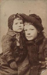 | Keywords: children portraits women groupshot people monochrome Photographer: Reuben R. Sallows (1855 - 1937) Description: Studio portrait of two children dressed for winter; younger child on left wears a coat, a hat trimmed with ribbon, and mittens; older girl, seated on right wears hat and coat; Sallows imprint across bottom; writing in ink on back identifies subjects 'Lottie Green Langell, Florence Sallows Saunders, 1892'. Object ID : 0386-rrs-ogohc-ph View additional photographs by Sallows that are held in other collections at the Reuben R. Sallows Digital Library. Order a higher-quality version of this item by contacting the Huron County Museum (fee applies). Photographer: Reuben R. Sallows (1855 - 1937) Description: Studio portrait of two children dressed for winter; younger child on left wears a coat, a hat trimmed with ribbon, and mittens; older girl, seated on right wears hat and coat; Sallows imprint across bottom; writing in ink on back identifies subjects 'Lottie Green Langell, Florence Sallows Saunders, 1892'. Object ID : 0386-rrs-ogohc-ph View additional photographs by Sallows that are held in other collections at the Reuben R. Sallows Digital Library. Order a higher-quality version of this item by contacting the Huron County Museum (fee applies). |