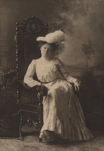 | Keywords: portraits women people monochrome outdoor Photographer: Reuben R. Sallows (1855 - 1937) Description: Full-length studio portrait of young woman seated, facing photographer, in high-backed ornately carved arm chair; dressed in a light-coloured skirt with gathered hem, long sleeved, high necked lace blouse, upswept hair, large feathered hat; braided pillow and fern on right of frame; painted backdrop; Sallows imprint in bottom right corner of matte; writing on back identifies subject Lottie Green Langell Object ID : 0446-rrs-ogohc-ph View additional photographs by Sallows that are held in other collections at the Reuben R. Sallows Digital Library. Order a higher-quality version of this item by contacting the Huron County Museum (fee applies). Photographer: Reuben R. Sallows (1855 - 1937) Description: Full-length studio portrait of young woman seated, facing photographer, in high-backed ornately carved arm chair; dressed in a light-coloured skirt with gathered hem, long sleeved, high necked lace blouse, upswept hair, large feathered hat; braided pillow and fern on right of frame; painted backdrop; Sallows imprint in bottom right corner of matte; writing on back identifies subject Lottie Green Langell Object ID : 0446-rrs-ogohc-ph View additional photographs by Sallows that are held in other collections at the Reuben R. Sallows Digital Library. Order a higher-quality version of this item by contacting the Huron County Museum (fee applies). |