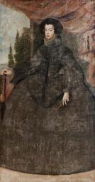 | Keywords: Porträtt, Elisabeth av Bourbon, drottning av Spanien - Skoklosters slott - 88978.tif Elisabeth av Spanien drottning plain text Oljemålning på duk <br/>Stående helfigur fas vänster <br/>Svart mönstrad dräkt med styv kjol och liv med stora skört <br/>Hög pipkrage och pipmanschetter Högra handen stöder mot stolsrygg i vänstra solfjäder <br/>I bakgrunden utsikt över landskap upptill och till höger rött draperi <br/>Kilad spännram På lapp på spännramen Velasques hans skola Elisabeth Frankrike <br/> STORA SPANSKA MÄSTARE NR 109 Nationalmuseum Stockholm 1959-60 m m Enl denna katalog Elisabeth av Frankrike drottning av Spanien Återgår på knästycke av Velasques´ atelje På spännramen med svart färg Sk 1 <br/>Blekröd ram med målade ornament i guldbrons Ramlistens bredd 100 mm Ramen ej ursprungligen tillhörande original caption Porträtt Elisabeth av Bourbon drottning av Spanien <br/> Nyckelord Klänning Elisabeth Bourbon Drottningkläder Drottning Spanien Frisyr Målning Föremålsbild Kvinna Drottningar decade 1630 oil on canvas size mm 1060 1985 SKO Carl Gustaf Wrangel place of origin original filename sm_dig3547 24490 inventory number SKO 3172 88978 PD Jens Mohr Jens Mohr Dresses Hair fashion Women in art Portrait paintings Media contributed by LSH unmatched creator Media contributed by LSH unmatched keyword Media contributed by LSH tag as oil on canvas Media contributed by LSH 2013-10 |