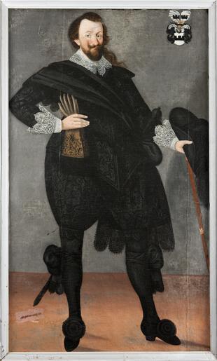 | Keywords: Porträtt. Herman Wrangel. Togs till utställningen Skokloster gods - 400 Ã¥r - Skoklosters slott - 87820.tif Herman Wrangel riksrÃ¥d fältmarskalk plain text Helfigur stÃ¥ende fas höger <br/>Höger hand i sidan vänster hand hÃ¥ller käpp och hatt Svart sammetsdräkt svart axelbindel spetskrage och manschetter värja <br/>I övre högra hörnet vapensköld med krenelerad mur original caption Porträtt Herman Wrangel Togs till utställningen Skokloster gods - 400 Ã¥r <br/> Nyckelord Porträtt Herman Wrangel Man Mustasch Spets Herrmode 1600-tal FöremÃ¥lsbild Barocken Stormaktstiden 1624 oil on canvas size mm 1820 1070 SKO place of origin original filename sm_dig3285 23525 inventory number SKO 2267 87820 PD Jens Mohr Herman Wrangel 1585 “1643 Jens Mohr Georg Günther Kräill 17th-century portrait paintings not categorised by year Male 17th-century men of Sweden 17th-century portrait paintings in Sweden 17th-century portrait paintings of standing men at full length 17th-century portraits with coat of arms Baroque paintings Black clothing in art male Canes in portrait paintings Lace collars in art Male clothing Male portraits holding glove Male shoes in portrait paintings Portrait paintings of men with moustaches Portrait paintings of men holding hats Portrait paintings of men with swords Right hand on hip in portrait paintings Sweden 1611-1718 Media contributed by LSH unmatched creator Media contributed by LSH unmatched keyword Media contributed by LSH 2013-10 |