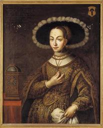 | Keywords: Porträtt. Margareta Eriksdotter Vasa. Hillebrandt - Skoklosters slott - 47695.tif Margareta Eriksdotter Vasa plain text Midjebild stående fas vänster <br/>Gråblå klänning med blommönster i guld smala underärmar vida uppslitsade överärmar rund urringning <br/>Tätt åtsittande vit plisserad krage guldkedjor runt halsen <br/>Mörk vidbrättad hatt med vita plymer runt om smalt band under hakan Hårnät av guldtråd Höger hand håller i hattbandet vänster hand håller i vit duk <br/>T v slagur av guldmetall på bord med röd duk <br/>I övre vänstra hörnet inskrift med svart färg Margareta Wasa Dotter af Riksrådet Riddaren och ståthollaren Herr Eric Johansson Wasa till Rijdboholm Gift 1 mo med Riksrådet och Riddaren Herr Joachim Pedersson Brahe Till Tärna 2 do med Grefve Johan von der Hoija <br/>I övre högra hörnet vapensköld med svart vase mot guld <br/>Stiftad spännram På spännramens baksida hopskrivet liggande 5 och stående 4 blyerts 1 5 cm h <br/>Förgyld profilerad ram bredd 90 mm original caption Porträtt Margareta Eriksdotter Vasa Hillebrandt other date century 19 oil on canvas size mm 800 985 SKO Brahe grevliga ätten nr 1 place of origin original filename sm_t7282_1654 22921 inventory number SKO 1654 47695 PD Samuel Uhrdin Samuel Uhrdin Portrait paintings Media contributed by LSH unmatched creator Margareta Eriksdotter Vasa House of Vasa 16th-century women of Sweden Media contributed by LSH 2013-10 |