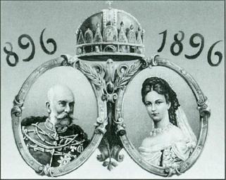 | Keywords: Portrayal of Franz Joseph and his wife Elisabeth on a millennium memorial leaf with the crown.jpg author 1896 Országos Széchényi Könyvtár Budapest object history credit line accession number own scanned by Szilas from A magyar Szent Korona by Tóth Endre Szelényi Károly Kossuth 2000 Budapest PD-old-100 Holy Crown of Hungary in art Franz Joseph I of Austria in 1896 Empress Elisabeth of Austria in portraits | ||||