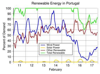 | Keywords: Portugal renewable energy production February 11-17 2016.svg translate yes en For over half of the week of February 11-17 2016 all of the electricity used in Portugal was generated from renewable energy A peak of 160 of demand was produced from renewable energy from 8 to 9 am on February 14 Excess electricity was exported when generation exceeded 100 of demand Data source https //transparency entsoe eu/generation/r2/actualGenerationPerProductionType/show entsoe own Delphi234 2016-05-21 Generated with Wikimedia SVG Chart SVG Chart/box Cc-zero Solar energy in Portugal Wind power in Portugal Renewable energy in Portugal February 2016 in Portugal |