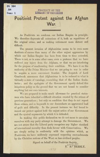 Keywords: Positivist Protest against the Afghan War WDL11795.png Artwork ru Английский позитивистский комитет fr Comité positiviste anglais en English Positivist Committee zh 英国实证主义 协会 pt Comitê Positivista Inglês ar اللجنة الوضعية الإنجليزية es Comité Positivista Inglés ru П отесты позитивистов п отив Афганской войны fr Protestation positiviste contre la guerre anglo-afghane en Positivist Protest against the Afghan War zh 实证主义 反对阿富汗战争 pt Positivistas protestam contra a Guerra do Afeganistão ar احتجاج للوضعيين ضد الحرب الأفغانية ru Этот документ п едставляет собой одност аничный манифест изданный Позитивистским обществом в Лондоне в качестве п отеста п отив Вто ой англо-афганской войны кото ая началась в нояб е 1878 года когда Великоб итания опасаясь как ей казалось оста оссийского влияния в Цент альной Азии вто глась в Афганистан с те ито ии Б итанской Индии В тексте гово ится Будучи позитивистами мы п инципиально осуждаем нашу Индийскую импе ию Поэтому мы выступаем п отив ее асши ения Похоже настоящее вто жение в Афганистан еще меньше подлежит оп авданию чем многие д угие случаи несп аведливой аг ессии в езультате кото ых пе иодически п оисходило асши ение нашей Индийской импе ии В данном случае в отличие от некото ых д угих нет даже того п едлога что мы пост адали от нападения афганцев или вмешиваемся с целью улучшения жизни населения ст аны П отест подписан от лица общества его п езидентом Э С Эдва дом Спенсе ом Бизли Позитивистское общество было о ганизацией кото ая выступала за социальные ефо мы отстаивала п ава абочих и п отестовала п отив Б итанской импе ии и б итанской военно-мо ской мощи по-видимому опи аясь на п инципы п овозглашенные ф анцузским философом Огюстом Контом 1798 1857 гг одоначальником позитивизма <br>Афганские войны; Политика и уп авление; Позитивизм fr Ce document est un manifeste d'une page publié par la Société positiviste de Londres pour protester contre la seconde guerre anglo-afghane qui commença en novembre 1878 lorsque la Grande-Bretagne se sentant menacée par l'influence croissante des Russes en Asie centrale envahit l'Afghanistan depuis l'Inde britannique Le texte indique  « En tant que positivistes nous condamnons notre Empire indien dans son principe Nous désapprouvons de ce fait toutes ses expansions L'invasion actuelle de l'Afghanistan semble être plus dénuée d'excuse que la plupart des autres agressions injustes grâce auxquelles notre Empire indien s'est peu à peu étendu Nous ne pouvons même pas prétexter comme ce fut parfois le cas que les Afghans nous ont porté préjudice ou que nous intervenons dans le but d'améliorer leurs conditions de vie » La protestation est signée au nom de la société par son président E S Edward Spencer  Beesly La Société positiviste organisation militant pour la réforme sociale et les droits des travailleurs et contre l'Empire britannique et la puissance maritime de la Grande-Bretagne fut apparemment fondée sur des principes énoncés par le philosophe français Auguste Comte 1798 1857 père du positivisme <br>Guerres afghanes; Politique et gouvernement; Positivisme en This document is a one-page manifesto issued by the Positivist Society in London to protest the Second Anglo-Afghan War which began in November 1878 when Great Britain fearful of what it saw as growing Russian influence in Central Asia invaded Afghanistan from British India The text declares As Positivists we condemn our Indian Empire in principle We therefore deprecate all extensions of it The present invasion of Afghanistan seems to be even more destitute of excuse than many of the other unjust aggressions by which our Indian Empire has been from time to time extended There is not as in some other cases even a pretence that we have suffered any injury from the Afghans or that we are interfering for the purpose of ameliorating their condition The protest is signed on behalf of the society by its president E S Edward Spencer Beesly The Positivist Society was an organization that campaigned for social reform and the rights of workers and against the British Empire and British sea power ostensibly on the basis of principles articulated by the French philosopher Auguste Comte 1798 1857 the founder of positivism <br>Afghan Wars; Politics and government; Positivism zh 此文件是 份单页宣 ,是伦敦实证主义 协会为反对第二次英阿战争 发表 这次战争于 1878 年 11 爆发,当时英国对俄罗斯 中亚 区的影响力不断扩大感到担忧,因此从英属印度入侵阿富汗 声明如下: 为实证主义 ,我们从原则上谴责我们的印度 国,也因此反对它的 扩张 比起我们的印度 国 持续扩张过程中进行的许多其他 正义的侵略,目前对阿富汗的入侵似乎更加缺乏理由 很多其他情况