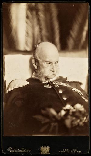 | Keywords: Post mortem portrait of Kaiser Wilhelm I, 1888.jpg Kaiser Wilhelm I 1888 <br />Photo pasted on black paper gilt edges with a post-mortem portrait lying in Emperor Wilhelm I The Emperor is the head against a pillow put up and is dressed in uniforms which several awards including the breast star of the Order of the Black Eagle On the abdomen below the picture is a laurel wreath The Emperor is probably lying in the old Berlin Cathedral http //fotocollectie huisdoorn nl/HuDF-0083 1888 Reichard Lindner PD-old-100 Wilhelm I of Germany 1880s portrait photographs Reichard Lindner Deathbed portraits |