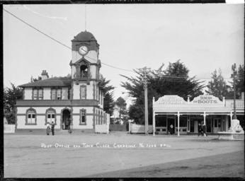 | Keywords: blackandwhite monochrome outdoor photo border black and white View of the Post Office and town clock at Cambridge, with the premises of The Premier Butchery, Duncan for Boots, and Jenkins & McIntyre, cycle dealers, on the right. Photographed by Price Photo Co. William Archer Price was operating as Price Photo Co circa 1920-1930, however Andrew James Duncan, boot store, and Jenkins & McIntyre, cycle dealers are listed in Wise's Post Office Directory between 1913 and 1915. Inscriptions: Inscribed - Photographer's title on negative -bottom left: Post Office and town clock. Cambridge. No. 3255. P.P.Co.. Quantity: 1 b&w original negative(s). Physical Description: Dry plate glass negative 4.5 x 6.5 inches Post Office and town clock at Cambridge, circa 1913-1915. Price, William Archer, 1866-1948 :Collection of post card negatives. Ref: 1/2-000799-G. Alexander Turnbull Library, Wellington, New Zealand. natlib.govt.nz/records/23238371 View of the Post Office and town clock at Cambridge, with the premises of The Premier Butchery, Duncan for Boots, and Jenkins & McIntyre, cycle dealers, on the right. Photographed by Price Photo Co. William Archer Price was operating as Price Photo Co circa 1920-1930, however Andrew James Duncan, boot store, and Jenkins & McIntyre, cycle dealers are listed in Wise's Post Office Directory between 1913 and 1915. Inscriptions: Inscribed - Photographer's title on negative -bottom left: Post Office and town clock. Cambridge. No. 3255. P.P.Co.. Quantity: 1 b&w original negative(s). Physical Description: Dry plate glass negative 4.5 x 6.5 inches Post Office and town clock at Cambridge, circa 1913-1915. Price, William Archer, 1866-1948 :Collection of post card negatives. Ref: 1/2-000799-G. Alexander Turnbull Library, Wellington, New Zealand. natlib.govt.nz/records/23238371 |