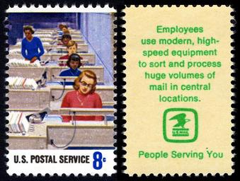 | Keywords: Postal Service Employees - Electronic Letter Routing - 8c 1973 issue U.S. stamp.jpg en Postal Service Employees - Electronic Letter Routing - 8-cent 1973 issue U S stamp Text Employees use modern high-speed equipment to sort and process huge volumes of mail in central locations U S MAIL logo People serving you 1973-04-30 U S Postal Service; National Postal Museum http //arago si edu/category_2034485 html Postal Service Employees Issue Bureau of Engraving and Printing Designed by Edward Vebell other versions PD-USGov Postal Service Employees Issue |