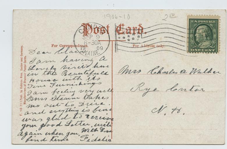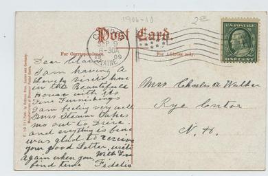 | Keywords: postcards correspondence fidelia clara walker clarawalker charles walker charleswalker camden rye center nh ryecenternh text document writing drawing sketch Postmarked Camden, September 9, 1909. Dear Clara, I am having a lovely visit here in this beautiful house with its fine furnishings. I am feeling very well. [? Stearn?] takes me out to drive and everything is fine. Was glad to receive your good letter. Write again when you find time. With love, Fidelia Addressed to: Mrs. Charles A. Walker Rye Center N.H. Postmarked Camden, September 9, 1909. Dear Clara, I am having a lovely visit here in this beautiful house with its fine furnishings. I am feeling very well. [? Stearn?] takes me out to drive and everything is fine. Was glad to receive your good letter. Write again when you find time. With love, Fidelia Addressed to: Mrs. Charles A. Walker Rye Center N.H. |