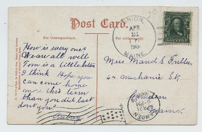 | Keywords: postcards correspondence camden union aubrey audrey tom maud fuller maudfuller text writing document drawing sketch Postmark #1: Union, April 21, 1908, 1pm  Postmark #2: Camden, April 21, 1908, 6pm  How is every one?  We are all well.  Tom is a little better I think.  Hope you can come home more this term than you did last don't you?  Aubrey  Addressed to: Miss Maud S. Fuller 64 Mechanic ST Camden, Maine Postmark #1: Union, April 21, 1908, 1pm  Postmark #2: Camden, April 21, 1908, 6pm  How is every one?  We are all well.  Tom is a little better I think.  Hope you can come home more this term than you did last don't you?  Aubrey  Addressed to: Miss Maud S. Fuller 64 Mechanic ST Camden, Maine  |