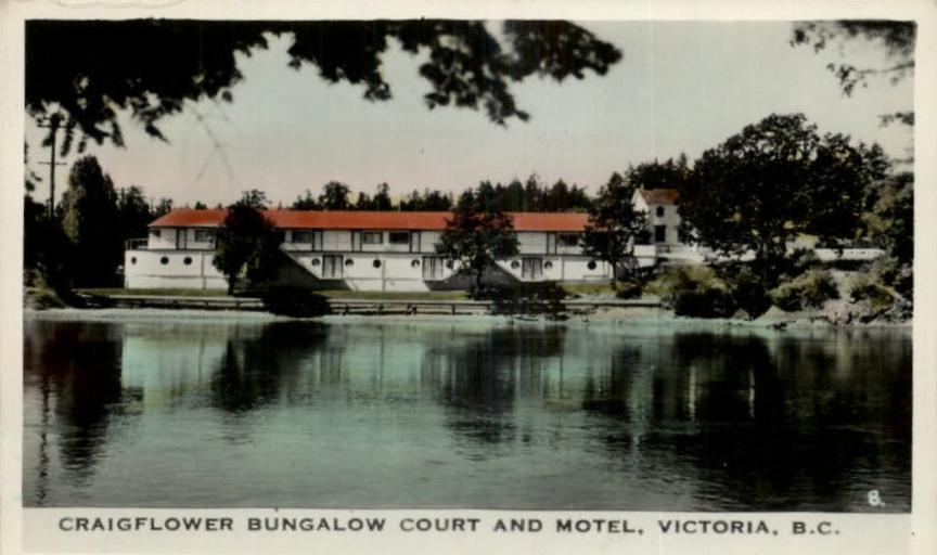 | Keywords: outdoor photo border "Craigflower Bungalow Court and Motel, Victoria, B.C." Made in Canada by the Gowen, Sutton Co., Ltd., Vancouver, B.C. Craigflower Auto Court, 110 (Old) Island Highway (Hwy. 1; Later Hwy. 1A), View Royal, BC. Built in the 1940s on the site of today's Craigflower Manor parking lot off Admirals Road at the south end of the Craigflower Bridge. Operated in conjunction with the Craigflower Bungalow Court at the NE corner of Admirals and Craigflower Roads in Esquimalt, BC. Renamed the Discovery Motel (1962-67) until demolition. SW view from the north end of the Craigflower Bridge across Portage Inlet. "Craigflower Bungalow Court and Motel, Victoria, B.C." Made in Canada by the Gowen, Sutton Co., Ltd., Vancouver, B.C. Craigflower Auto Court, 110 (Old) Island Highway (Hwy. 1; Later Hwy. 1A), View Royal, BC. Built in the 1940s on the site of today's Craigflower Manor parking lot off Admirals Road at the south end of the Craigflower Bridge. Operated in conjunction with the Craigflower Bungalow Court at the NE corner of Admirals and Craigflower Roads in Esquimalt, BC. Renamed the Discovery Motel (1962-67) until demolition. SW view from the north end of the Craigflower Bridge across Portage Inlet. |
