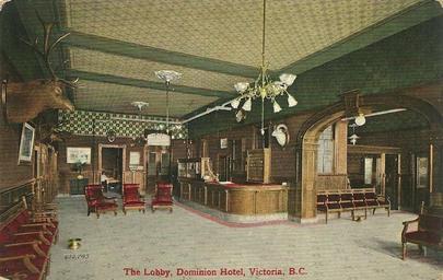 | Keywords: "The Lobby, Dominion Hotel, Victoria, B.C." Souvenir Post Card. Printed in Great Britain. "The Lobby, Dominion Hotel, Victoria, B.C. Seldom can a City Hotel boast of such a large and well-appointed Lobby as "The Dominion." The floor is laid with mosaic tiling. The walls are marble and oak and the seats richly upholstered. The Writing-Room adjoins the Lobby." Dominion Hotel, 759 Yates Street, Victoria, BC. Built 1890, additions 1900, 1913. Extant as the Dalton Hotel & Suites ( www.daltonhotel.ca/index.php ). "The Lobby, Dominion Hotel, Victoria, B.C." Souvenir Post Card. Printed in Great Britain. "The Lobby, Dominion Hotel, Victoria, B.C. Seldom can a City Hotel boast of such a large and well-appointed Lobby as "The Dominion." The floor is laid with mosaic tiling. The walls are marble and oak and the seats richly upholstered. The Writing-Room adjoins the Lobby." Dominion Hotel, 759 Yates Street, Victoria, BC. Built 1890, additions 1900, 1913. Extant as the Dalton Hotel & Suites ( www.daltonhotel.ca/index.php ). |