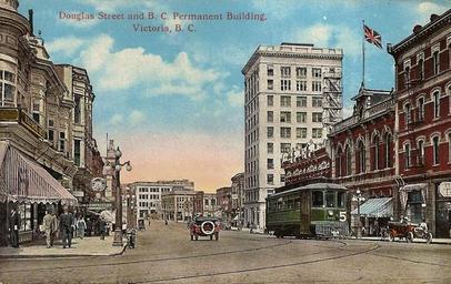 | Keywords: outdoor architecture building building complex road city skyline "Douglas Street and B. C. Permanent Building. Victoria, B. C." Post Card. Published by The Coast Publishing Co., Vancouver, B. C. Made in U.S.A. View looking north down Douglas Street into the 1300-block from the intersection at Yates Street in Victoria, BC on Vancouver Island. "Douglas Street and B. C. Permanent Building. Victoria, B. C." Post Card. Published by The Coast Publishing Co., Vancouver, B. C. Made in U.S.A. View looking north down Douglas Street into the 1300-block from the intersection at Yates Street in Victoria, BC on Vancouver Island. |