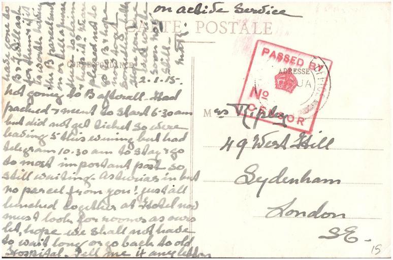 | Keywords: postcard ww1 france public domain publicdomain nurse ripley nurseripley text writing document Sent by a nurse, Margaret Ripley, to her mother back in England. As far as I can tell (corrections and additions welcome) this reads: "2.1.15 Not going to B[ordeaux] after all. Had packed and went to start at 6.30am but did not get picked so were leaving 5 this evening but had telegram 10.30am to stay & go to most important post so still waiting. Askurias in but no parcel from yo! Just all lunched togther at Hotel now must look for rooms as ours let. Hope we shall not have to wait long or go back to old Hospital. Tell me if any letters have gone to B[ordeaux] & I will ask for them & if it is worth having the B parcel sent on or tell a nurse there to claim & keep it? We are pleased not to go to B & hope now to get something better. Hope you are well write soon No8 still. Mar" For more details of the story behind this album see www.flickr.com/photos/whatsthatpicture/sets/7215762769463... Sent by a nurse, Margaret Ripley, to her mother back in England. As far as I can tell (corrections and additions welcome) this reads: "2.1.15 Not going to B[ordeaux] after all. Had packed and went to start at 6.30am but did not get picked so were leaving 5 this evening but had telegram 10.30am to stay & go to most important post so still waiting. Askurias in but no parcel from yo! Just all lunched togther at Hotel now must look for rooms as ours let. Hope we shall not have to wait long or go back to old Hospital. Tell me if any letters have gone to B[ordeaux] & I will ask for them & if it is worth having the B parcel sent on or tell a nurse there to claim & keep it? We are pleased not to go to B & hope now to get something better. Hope you are well write soon No8 still. Mar" For more details of the story behind this album see www.flickr.com/photos/whatsthatpicture/sets/7215762769463... |