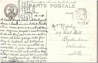 | Keywords: postcard ww1 france public domain publicdomain nurse ripley nurseripley text writing document Sent by a nurse, Margaret Ripley, to her mother back in England. Note that although the card is of Paris, the postmark shows this was sent after Margaret arrived in Berques, on the coast. As far as I can tell (corrections and additions welcome) this reads: "A hard days work at last just done & back in our billet. Sister & I in room over a small station. {??] very nice people & most anxious to do all they can & we can sit in room at back of shop with fire they in kitchen so Todd[?] joins us & we are as comfortable as possible. I gave wrong address agian should not address hospital which is call[ed] St Union but just headquarters - St Winse*, Rue de College, Bergues if we get settled will give lodging ad[dress] but place so small may have to stay here. Mar" * I suspect this is St Winoc - see www.stwinoc.fr/ It's interesting to note after several weeks in France this appears to be the first sense that Margaret has found 'proper' work and is likely to stay. For more details of the story behind this album see www.flickr.com/photos/whatsthatpicture/sets/7215762769463... Sent by a nurse, Margaret Ripley, to her mother back in England. Note that although the card is of Paris, the postmark shows this was sent after Margaret arrived in Berques, on the coast. As far as I can tell (corrections and additions welcome) this reads: "A hard days work at last just done & back in our billet. Sister & I in room over a small station. {??] very nice people & most anxious to do all they can & we can sit in room at back of shop with fire they in kitchen so Todd[?] joins us & we are as comfortable as possible. I gave wrong address agian should not address hospital which is call[ed] St Union but just headquarters - St Winse*, Rue de College, Bergues if we get settled will give lodging ad[dress] but place so small may have to stay here. Mar" * I suspect this is St Winoc - see www.stwinoc.fr/ It's interesting to note after several weeks in France this appears to be the first sense that Margaret has found 'proper' work and is likely to stay. For more details of the story behind this album see www.flickr.com/photos/whatsthatpicture/sets/7215762769463... |