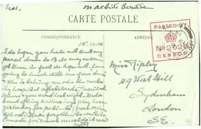 | Keywords: postcard france ww1 public domain publicdomain nurse ripley nurseripley text document writing Sent by a nurse, Margaret Ripley, to her sister back in England. As far as I can tell (corrections and additions welcome) this reads: "18.12.14 I do hope you have not sent any parcel down to B [aluding to an earlier card which said they were heading to Bordeaux]. We may never get there in fact we hope not. I am going to lunch with one of our ['???'] and she is taking me over the maternity[?] hospital afterwards. Received Sphere & your card last night. Had a band of tiny[?] sailor boys play here yesterday for patients (from orphan school). Have forgotten to write to Canada for Xmas must do it now. Mar" For more details of the story behind this album see www.flickr.com/photos/whatsthatpicture/sets/7215762769463... Sent by a nurse, Margaret Ripley, to her sister back in England. As far as I can tell (corrections and additions welcome) this reads: "18.12.14 I do hope you have not sent any parcel down to B [aluding to an earlier card which said they were heading to Bordeaux]. We may never get there in fact we hope not. I am going to lunch with one of our ['???'] and she is taking me over the maternity[?] hospital afterwards. Received Sphere & your card last night. Had a band of tiny[?] sailor boys play here yesterday for patients (from orphan school). Have forgotten to write to Canada for Xmas must do it now. Mar" For more details of the story behind this album see www.flickr.com/photos/whatsthatpicture/sets/7215762769463... |