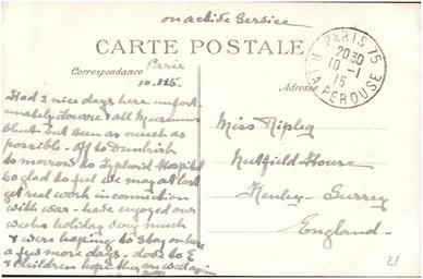 | Keywords: postcard ww1 france public domain publicdomain nurse ripley nurseripley text document writing monochrome Sent by a nurse, Margaret Ripley, to her sister back in England. As far as I can tell (corrections and additions welcome) this reads: "Had 2 nice days here unfortunately Louvre & all museums shut but seen as much as possible. Off to Dunkirk tomorrow to typhoid hospital so glad to feel we may at last get real work in connection with war. Have enjoyed our week's holiday very much & were hoping to stay on here a few more days. Love to E & children. Hope they are well again. Mar For more details of the story behind this album see www.flickr.com/photos/whatsthatpicture/sets/7215762769463... Sent by a nurse, Margaret Ripley, to her sister back in England. As far as I can tell (corrections and additions welcome) this reads: "Had 2 nice days here unfortunately Louvre & all museums shut but seen as much as possible. Off to Dunkirk tomorrow to typhoid hospital so glad to feel we may at last get real work in connection with war. Have enjoyed our week's holiday very much & were hoping to stay on here a few more days. Love to E & children. Hope they are well again. Mar For more details of the story behind this album see www.flickr.com/photos/whatsthatpicture/sets/7215762769463... |
