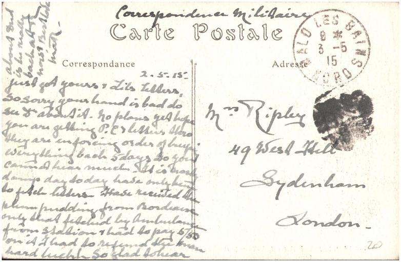 | Keywords: postcard ww1 world war 1 worldwar1 france 1915 ripley public domain publicdomain nurse ripley nurseripley text writing document Sent by a nurse, Margaret Ripley, to her mother back in England. As far as I can tell (corrections and additions welcome) this reads: "2.5.15 Just got yours & Lils letters. So sorry your hand is bad do see Dr about it. No plans yet hope you are getting P.C & letters thro[?] they are enforcing order of keeping everything back 5 days so you cannot hear much. It is mostly damp day today have only been to fetch letters. Have received the plum pudding from Bordeaux only that fetched by ambulance from Station & had to pay 5/50[?] on it I had to refund the man hard luck[?]. So glad to hear about Dud is he really back at R[???] now? Best love Mar" For more details of the story behind this album see www.flickr.com/photos/whatsthatpicture/sets/7215762769463... Sent by a nurse, Margaret Ripley, to her mother back in England. As far as I can tell (corrections and additions welcome) this reads: "2.5.15 Just got yours & Lils letters. So sorry your hand is bad do see Dr about it. No plans yet hope you are getting P.C & letters thro[?] they are enforcing order of keeping everything back 5 days so you cannot hear much. It is mostly damp day today have only been to fetch letters. Have received the plum pudding from Bordeaux only that fetched by ambulance from Station & had to pay 5/50[?] on it I had to refund the man hard luck[?]. So glad to hear about Dud is he really back at R[???] now? Best love Mar" For more details of the story behind this album see www.flickr.com/photos/whatsthatpicture/sets/7215762769463... |