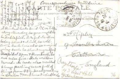 | Keywords: postcard france dunkirk dunkerque 1915 war world war 1 worldwar1 ww1 public domain publicdomain nurse ripley nurseripley text writing document drawing sketch monochrome Sent by a nurse, Margaret Ripley, to her mother back in England. It's amusing to see that the last couple of cards were sent to the home address in Kenley and redirected to Eastbourne, and now this one has been addressed there and redirected back! As far as I can tell (corrections and additions welcome) this reads: "19.3.15 I think I have sent P.C. or letter every other day so you ought to be satisfied. Awful weather today snow & wind. So cold. Came back here at 11.30 am just going back to show myself at Hospital 3pm & then back to our nice fire. Have written Maud. We have also received 6 huge packing cases full of things from FFN [French Flag Nurses] Headquarters in London. Don't know what to do with them have had to put them in yard as they entirely filled the kitchen or bath room & John (who is extra large size could not move. Love to both Mar" For more details of the story behind this album see www.flickr.com/photos/whatsthatpicture/sets/7215762769463... Sent by a nurse, Margaret Ripley, to her mother back in England. It's amusing to see that the last couple of cards were sent to the home address in Kenley and redirected to Eastbourne, and now this one has been addressed there and redirected back! As far as I can tell (corrections and additions welcome) this reads: "19.3.15 I think I have sent P.C. or letter every other day so you ought to be satisfied. Awful weather today snow & wind. So cold. Came back here at 11.30 am just going back to show myself at Hospital 3pm & then back to our nice fire. Have written Maud. We have also received 6 huge packing cases full of things from FFN [French Flag Nurses] Headquarters in London. Don't know what to do with them have had to put them in yard as they entirely filled the kitchen or bath room & John (who is extra large size could not move. Love to both Mar" For more details of the story behind this album see www.flickr.com/photos/whatsthatpicture/sets/7215762769463... |