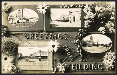 | Keywords: Shows a photograph of an arrangement of four postcard photographs interspersed with floral decoration. The four photographs are of: Feilding Post Office, Fergusson Street with the Spence & Spence Bon Marche store at right; Manchester Street; and Manchester Square. Quantity: 1 b&w photo-mechanical print(s). Physical Description: Photograph on postcard 89 x 138 mm [Postcard]. Greetings from Feilding. A1590. New Zealand post card (carte postale). Aldersley series [ca 1910]. Various artists :[Postcards donated by Mrs E F Goldsmith, Levin. 1905-1910]. Ref: Eph-A-POSTCARDS-Goldsmith-04. Alexander Turnbull Library, Wellington, New Zealand. natlib.govt.nz/records/23070802 Shows a photograph of an arrangement of four postcard photographs interspersed with floral decoration. The four photographs are of: Feilding Post Office, Fergusson Street with the Spence & Spence Bon Marche store at right; Manchester Street; and Manchester Square. Quantity: 1 b&w photo-mechanical print(s). Physical Description: Photograph on postcard 89 x 138 mm [Postcard]. Greetings from Feilding. A1590. New Zealand post card (carte postale). Aldersley series [ca 1910]. Various artists :[Postcards donated by Mrs E F Goldsmith, Levin. 1905-1910]. Ref: Eph-A-POSTCARDS-Goldsmith-04. Alexander Turnbull Library, Wellington, New Zealand. natlib.govt.nz/records/23070802 |