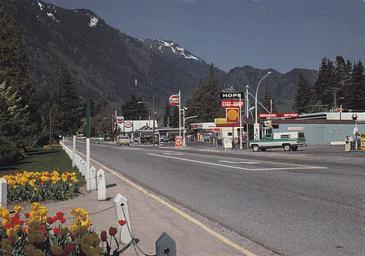 | Keywords: outdoor road "HOPE British Columbia, Canada Here on the banks of the mighty Fraser River one can enjoy the awe-inspiring scenery, clean fresh air and beauty found in this unique little town, enhanced by the flowers, green grass and trees. Photo by Ken Buchanan" LC-869 Super Card Post Card. SC-3571. Dist. by Lakeside Colour Productions Ltd.•1443 Lakeside S. Dr., Williams Lake, B.C., Canada V2G 3A7. Printed in Canada by Lawson Graphics Pacific Limited, Vancouver, British Columbia. View looking north along Water Avenue (Trans-Canada Highway, Hwy. 1) from the intersection at Wallace Street in Hope, BC. "HOPE British Columbia, Canada Here on the banks of the mighty Fraser River one can enjoy the awe-inspiring scenery, clean fresh air and beauty found in this unique little town, enhanced by the flowers, green grass and trees. Photo by Ken Buchanan" LC-869 Super Card Post Card. SC-3571. Dist. by Lakeside Colour Productions Ltd.•1443 Lakeside S. Dr., Williams Lake, B.C., Canada V2G 3A7. Printed in Canada by Lawson Graphics Pacific Limited, Vancouver, British Columbia. View looking north along Water Avenue (Trans-Canada Highway, Hwy. 1) from the intersection at Wallace Street in Hope, BC. |