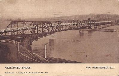 | Keywords: text "Westminster Bridge. New Westminster, B.C. Published for J. J. MacKay & Co., New Westminster, B.C. 1387" Warwick Bro's & Rutter, Limited, Printers, Toronto New Westminster Low Level Road-Rail Bridge with swing span. Known locally as the Fraser River Bridge. Photograph circa-1905. Bridge built by the province of British Columbia and opened in 1904. It was the first crossing of the lower Fraser River. It serviced three railways: the Canadian Northern Pacific Rwy., the Vancouver Victoria & Eastern Rwy., and the B.C. Electric Railway Co. By road, the bridge gave access from Vancouver-New Westminster to the farmlands of Langley, Surrey and Delta, to the old Yale Road up the Fraser Valley, and to the Pacific Highway south to the U.S. border. Both road and rail traffic increased steadily in weight and frequency over the years to the point of being a nuisance during peak periods, especially to truckers. The upper highway deck was one way width for trucks, and eventually (1937) was superseded by the 4-lane high level Pattullo Bridge alongside to the south. "Westminster Bridge. New Westminster, B.C. Published for J. J. MacKay & Co., New Westminster, B.C. 1387" Warwick Bro's & Rutter, Limited, Printers, Toronto New Westminster Low Level Road-Rail Bridge with swing span. Known locally as the Fraser River Bridge. Photograph circa-1905. Bridge built by the province of British Columbia and opened in 1904. It was the first crossing of the lower Fraser River. It serviced three railways: the Canadian Northern Pacific Rwy., the Vancouver Victoria & Eastern Rwy., and the B.C. Electric Railway Co. By road, the bridge gave access from Vancouver-New Westminster to the farmlands of Langley, Surrey and Delta, to the old Yale Road up the Fraser Valley, and to the Pacific Highway south to the U.S. border. Both road and rail traffic increased steadily in weight and frequency over the years to the point of being a nuisance during peak periods, especially to truckers. The upper highway deck was one way width for trucks, and eventually (1937) was superseded by the 4-lane high level Pattullo Bridge alongside to the south. |