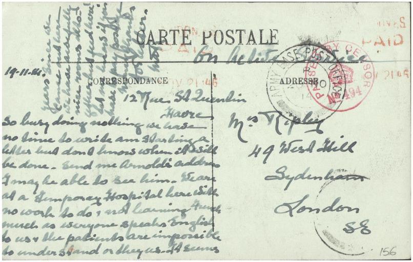 Keywords: postcard ripley sydenham public domain publicdomain ww1 nurse ripley nurseripley document text writing drawing sketch This is the first postcard in the album that was sent from Margaret Ripley to her mother. It was sent from Le Havre and is clearly marked "On Active Service". From what I can work out (corrections welcome), it reads: "12 Rue St Quentin, Havre So busy doing nothing we have no time to write am starting a letter but don't know when it will be done. Send me Arnold's address I may be able to see him. We are at a Temporary Hospital here with no work to do and learning French as much as everyone speaks English to us & the patients are impossible to understand or they us. It seems years since we came out here. We have awfully nice rooms altogether but feed here! Let me know if you have to pay postage. Many thanks for letter. Mar" This is the first postcard in the album that was sent from Margaret Ripley to her mother. It was sent from Le Havre and is clearly marked "On Active Service". From what I can work out (corrections welcome), it reads: "12 Rue St Quentin, Havre So busy doing nothing we have no time to write am starting a letter but don't know when it will be done. Send me Arnold's address I may be able to see him. We are at a Temporary Hospital here with no work to do and learning French as much as everyone speaks English to us & the patients are impossible to understand or they us. It seems years since we came out here. We have awfully nice rooms altogether but feed here! Let me know if you have to pay postage. Many thanks for letter. Mar" |