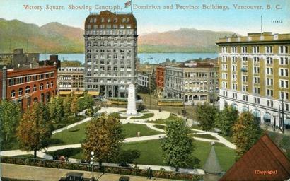 | Keywords: outdoor architecture building complex building "Victory Square, Showing Cenotaph, Dominion and Province Buildings, Vancouver, B. C. (Copyright)" Published by The Coast Publishing Co., Vancouver, B. C. Victory Square and Cenotaph, at the SW corner of West Hastings and Cambie Streets, completed in 1924. View looking north from the Central Public School building (1890-1948). "Victory Square, Showing Cenotaph, Dominion and Province Buildings, Vancouver, B. C. (Copyright)" Published by The Coast Publishing Co., Vancouver, B. C. Victory Square and Cenotaph, at the SW corner of West Hastings and Cambie Streets, completed in 1924. View looking north from the Central Public School building (1890-1948). |
