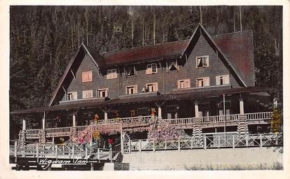 | Keywords: building architecture outdoor photo border "Wigwam Inn." Postcard. Wigwam Inn, Indian Arm, BC. The Wigwam Inn, located at the north end of Indian Arm, originally opened as a luxury German Biergarten resort and fishing lodge in 1910. A daily steamship route, using the sternwheeler Skeena, brought customers and supplies to the Inn. The property was operated by Count Gustav Constantin Alvo Van Alvensleben during its "glory days" before World War I, and by other operators until 1963. The property was then sold several times, with a somewhat checkered history, including a stint as a gambling casino, which led to a raid by the RCMP. The Inn is currently owned and operated by the Royal Vancouver Yacht Club as an outstation for club members. There is no public moorage available at the Wigwam docks; reciprocal privileges are not available to members of any other yacht clubs. "Wigwam Inn." Postcard. Wigwam Inn, Indian Arm, BC. The Wigwam Inn, located at the north end of Indian Arm, originally opened as a luxury German Biergarten resort and fishing lodge in 1910. A daily steamship route, using the sternwheeler Skeena, brought customers and supplies to the Inn. The property was operated by Count Gustav Constantin Alvo Van Alvensleben during its "glory days" before World War I, and by other operators until 1963. The property was then sold several times, with a somewhat checkered history, including a stint as a gambling casino, which led to a raid by the RCMP. The Inn is currently owned and operated by the Royal Vancouver Yacht Club as an outstation for club members. There is no public moorage available at the Wigwam docks; reciprocal privileges are not available to members of any other yacht clubs. |