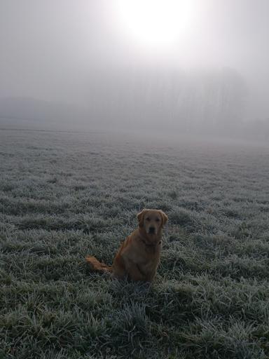 Keywords: postkartenmotiv golden retriever dog fog dew cold sunrise forest meadow landscape animal pets attention winter sweet