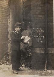 | Keywords: postman post address chalk mail mailman delivery uniform sack brickwall 1922 1920s fire monochrome Photograph of the aftermath of the Great Timber Yard Fire in Hartlepool, 1922. Shows the postman attempting to deliver letters to the ruined houses. Forwarding addresses have been chalked on the walls in cases where victims have gone to stay with kindly neighbours, relatives or friends, their homes having been destroyed. Photograph Collection No : 366 Images from Hartlepool Cultural Services that are part of The Commons on Flickr are labeled 'no known copyright restrictions' indicating that Hartlepool Cultural Services is unaware of any current copyright restrictions on these images either because the copyright is waived or the term of copyright has expired. Commercial use of images is not permitted. Applications for commercial use or for higher quality reproductions should be made to Hartlepool Cultural Services, Sir William Gray House, Clarence Road, Hartlepool, TS24 8BT. When using the images please credit 'Hartlepool Cultural Services'. Photograph of the aftermath of the Great Timber Yard Fire in Hartlepool, 1922. Shows the postman attempting to deliver letters to the ruined houses. Forwarding addresses have been chalked on the walls in cases where victims have gone to stay with kindly neighbours, relatives or friends, their homes having been destroyed. Photograph Collection No : 366 Images from Hartlepool Cultural Services that are part of The Commons on Flickr are labeled 'no known copyright restrictions' indicating that Hartlepool Cultural Services is unaware of any current copyright restrictions on these images either because the copyright is waived or the term of copyright has expired. Commercial use of images is not permitted. Applications for commercial use or for higher quality reproductions should be made to Hartlepool Cultural Services, Sir William Gray House, Clarence Road, Hartlepool, TS24 8BT. When using the images please credit 'Hartlepool Cultural Services'. |
