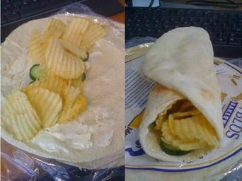 Keywords: PotatoChipWrap.jpg en A wrap made with cheese cucumber and potato chips own Charles Brooking 2010-10-18 Sandwich wraps