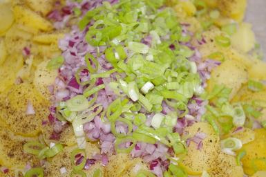 Keywords: potatoes eat food salt potatoes salty lunch staple food cooked cook court meal healthy delicious potato salad salted potatoes pepper salt and pepper salted salt seasoned preparation onions vitamins nutrition vegetarian kitchen feed vegetables frisch salad party appetizing cut garden party tasty enjoy sommerfest celebration prepare edible spring onions