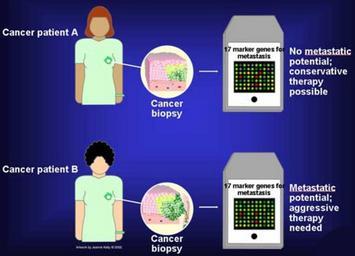 Keywords: Potential Markers for Metastasis.jpg en Text from Cancer gov Gene expression patterns are also being used as a tool for improving the diagnosis of breast cancer Microarrays have been used to examine the expression patterns of some 25 000 genes in tissues from breast cancer patients Computer cluster analysis of the patterns led to the identification of about 17 marker genes that can correctly identify about 90 percent of the women who would eventually develop metastases While still experimental such studies bring hope that clinicians will be able to act much sooner and use new technology to better monitor the women more likely to experience aggressive progression of their breast cancer 2014-01-28 21 29 25 http //www cancer gov/cancertopics/understandingcancer/moleculardiagnostics/AllPages National Cancer Institute PD-USGov Molecular biology Medicine Uploaded with UploadWizard