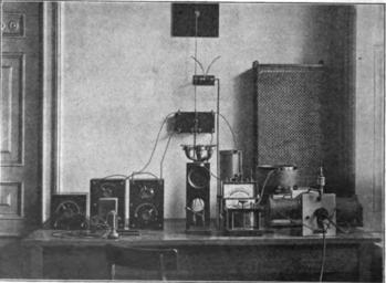 | Keywords: Poulsen's arc radiotelephone transmitter.jpg Poulsen arc radiotelephone transmitter built by Valdamar Poulsen around 1904 The Poulsen arc was an early radio transmitter technology that was used briefly until the mid 1920s when it was superseded by vacuum tube transmitters It was the first transmitter which produced undamped sinusoidal waves and so could be amplitude modulated AM to transmit sound <br/><br/> The photo shows Poulsen's first AM transmitter The Poulsen arc is on the right It consists of a rectangular arc chamber containing two electrodes to which a DC voltage of about 500 volts was applied creating a continuous electric arc A resonant circuit consisting of a capacitor on desk to right of arc chamber and inductor behind arc chamber was connected across the arc The negative resistance of the arc canceled the positive resistance of the tuned circuit exciting sinusoidal radio frequency oscillating currents in the circuit The arc was between the poles of an electromagnet cylindrical objects attached to each side of the chamber which created a magnetic field across the arc The arc chamber was filled with alcohol vapor from alcohol dripping from the cup on top These two features enabled the arc to oscillate at a high enough frequency for radio transmission The tuned circuit was attached through the transmission line on the wall to an outdoor wire antenna which radiated the energy as radio waves The carbon microphone center was connected directly in the antenna wire The sound waves striking the microphone's diaphragm put varying pressure on carbon granules varying its resistance thus varying the current allowed through to the antenna To handle the high power of the transmitter the microphone consists of three separate units attached to a single mouthpiece 1908 Retrieved October 10 2013 from https //books google com/books id ySTOAAAAMAAJ pg PA426 Gustav Eichhorn Jonathan Adolf Wilhelm Zenneck 1908 Jahrbuch der Drahtlosen Telegrafie und Telephonie Yearbook of Wireless Telegraphy and Telephony Verlag Von S Hirzel Leipzig Germany p 426 fig 1 on Google Books Gustav Eichhorn Jonathan Adolf Wilhelm Zenneck other versions PD-old-70-1923 Uploaded with UploadWizard Poulsen arc transmitters ImageNote 1 1040 664 138 163 1342 986 2 Arc chamber ImageNoteEnd 1 ImageNote 2 924 684 117 89 1342 986 2 Electromagnet ImageNoteEnd 2 ImageNote 3 1173 682 91 86 1342 986 2 Electromagnet ImageNoteEnd 3 ImageNote 4 778 701 141 117 1342 986 2 Variable tank capacitor ImageNoteEnd 4 ImageNote 5 889 575 158 99 1342 986 2 Tank inductor ImageNoteEnd 5 ImageNote 6 627 501 117 158 1342 986 2 High power carbon microphone in antenna lead has three driver units in series ImageNoteEnd 6 ImageNote 7 604 386 148 79 1342 986 2 Transmit/receive switch ImageNoteEnd 7 ImageNote 8 654 188 117 117 1342 986 2 Lightning arrester ImageNoteEnd 8 ImageNote 9 176 615 401 191 1342 986 2 Receiver ImageNoteEnd 9 ImageNote 10 1092 584 50 70 1342 986 2 Alcohol cup ImageNoteEnd 10 ImageNote 11 589 17 178 112 1342 986 2 Pass-through bushing in wall to outdoor wire antenna ImageNoteEnd 11 |