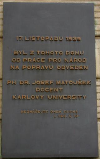 | Keywords: Praha-Smíchov-deska-Josef-Matoušek.jpg Smíchov en the Czech Republic <br /> Josef Matoušek en born January 13 1906 executed by the Nazis on November 17 1939 lived here Josef Matoušek cs 1906 1939 pamětní deska na zdi domu čp 1084 Švédská ulice čo 31 Praha- Smíchov cs <br /> Text 17 listopadu 1939 byl z tohoto domu od práce pro národ na popravu odveden PhDr Josef Matoušek docent Karlovy university<br />Nezhášejte oheň ducha I Tes 5 19 2011-12-03 own Jirka23 the house No 1084 a b c Josef Matoušek Plaques in Smíchov Švédská Prague Plaques to people in Prague Here-lived plaques in Prague World War II memorials in Prague 17 November Plaques referencing 1939 Cc-zero |