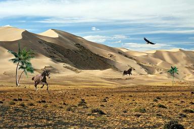 Keywords: prairie steppes mountains vegetation sand nature birds fly beauty horses animals eagles