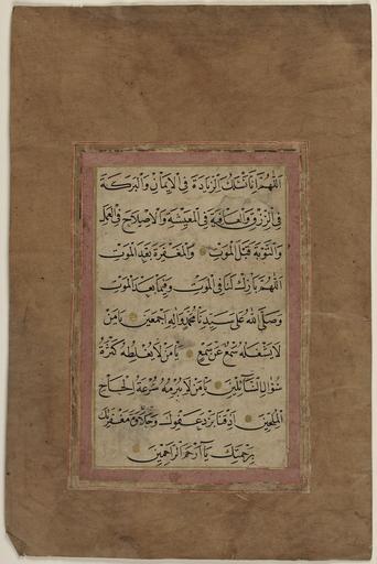 | Keywords: Prayer (Du'a) for Forgiveness WDL6847.png Artwork ru олитва дуа о п ощении fr Prière doua pour le pardon en Prayer Du'a for Forgiveness zh 请求宽恕的祈祷(都阿) pt Prece du'a por perdão ar دعاء استغفار ru Данная каллиг афическая панель включает яд молитв об ук еплении ве ы благословении здо овье и удаче ee владельцу Сюда же входят мольбы о п ощении до и после сме ти аконец в сбо нике соде жатся молитвы к П о оку ухаммеду и его семье а также воззвания к Аллаху как к самому илосе дному Текст выполнен че ными че нилами письмом насх и соде жит полное обозначение гласных звуков Отдельные части текста азделены золотыми медальонами что по ст укту е напоминает стихи Ко ана Текстовая панель на бежевом листе бумаги об амлена несколькими каймами и наклеена на больший по азме у ко ичневый лист с ка тонной подложкой а данном ф агменте нет ни даты ни подписи Однако текстовые панели подобные этой с азличными молитвами на а абском языке написанными ш ифтом насх п инадлежали пе у известных пе сидских каллиг афов воз ождающих данное письмо а именно и зы Ахмада ай изи уме в 1739 году / в 1152 году хидж ы Вассали Ши ази уме в 1846 году / в 1262 году хидж ы и их последователей Поэтому вполне возможно что данный каллиг афический ф агмент был выполнен в И ане в XVIII XIX веках <br>А абская каллиг афия; А абские укописи; Иллюмини ование укописей; Исламская каллиг афия; Исламские укописи; олитвы fr Ce panneau de calligraphie comprend plusieurs prières destinées à accroître la foi la bénédiction le bien-être et la bonne fortune de son propriétaire Il demande aussi le pardon pour avant et après la mort Enfin il propose des prières pour le prophète Mahomet et sa famille et invoque Dieu en tant que Très Miséricordieux Entièrement vocalisé le texte est exécuté en écriture naskh noire Les différentes parties du texte sont distinguées par des médaillons dorés une structure rappelant les versets coraniques Écrit sur une page de papier beige le panneau de texte est encadré de plusieurs bordures et collé sur une feuille plus grande de papier marron renforcé par du carton au dos Le fragment n'est ni daté ni signé Cependant les panneaux de texte comme celui-ci contenant diverses prières en arabe et en écriture naskh ont été faits par les célèbres calligraphes persans du renouveau du naskh Mirza Ahmad Nayrizi mort en 1152 après l'Hégire/1739 après J -C et Vassal-i Shirazi mort en 1262 après l'Hégire/1846 après J -C ainsi que leurs disciples Pour ces raisons il est possible que ce fragment de calligraphie ait été exécuté en Iran au XVIII<sup>e</sup> ou au XIX<sup>e</sup> siècle <br>Calligraphie arabe; Manuscrits arabes; Enluminures; Calligraphie islamique; Manuscrits islamiques; Prières en This calligraphic panel includes a number of prayers for increased faith blessing well-being and good fortune for its owner It also petitions for forgiveness both before and after death Finally it offers prayers for the Prophet Muhammad and his family and invokes God as the Most Merciful The text is executed in black Naskh script and is fully vocalized Separate parts of the text are divided by gold roundels a structure reminiscent of Qur'anic verses Written on a beige sheet of paper the text panel is framed by several borders and pasted to a larger brown sheet of paper backed by cardboard The fragment is neither dated nor signed However text panels such as this one providing various Arabic prayers in Naskh script were made by the famous Naskh-revival Persian calligraphers Mirza Ahmad Nayrizi died 1152 AH/1739 and Vassal-i Shirazi died 1262 AH/1846 and their followers For these reasons it is possible that this calligraphic fragment was made in Iran in the 18th or 19th centuries <br>Arabic calligraphy; Arabic manuscripts; Illuminations; Islamic calligraphy; Islamic manuscripts; Prayers zh 此书法字幅包括 些为其拥 定信仰,祈求赐福 福和吉祥的祈祷 还向 主请求宽恕生前死后的罪过 后还提供了为先知穆罕默德及其家人的祈祷,颂扬了 主的至仁至慈 文字以黑色纳斯赫体书写,并且被全部加上元音 文字内容的不同部分由金色的 形分隔 ,此结构类似 古兰经 经文的划分 字幅书写 米色的纸张上并裱 多个边框,然后粘贴到 张更大的棕色纸张上,背衬 纸 这幅残卷既没 标注日 也没 署名 此类字幅以纳斯赫体书写各种阿拉伯文祈祷词,由著名的复兴纳斯赫体波斯书法家米尔扎·艾哈迈德·纳伊里兹(Mirza Ahmad Nayrizi,卒于伊斯兰历 1152 年/公元 1739 年) 瓦萨尔·设拉子(Vassal-i Shirazi,卒于伊斯兰历 1262 年/公元 1846 年)和他们的追随 创 因此,这幅书法残卷可能是于 18 或 19 世纪 伊 创 的 <br>阿拉伯文书法; 阿拉伯语手稿; 插图; 伊斯兰书法; 伊斯兰手稿; 祈祷文 pt Este painel caligráfico inclui várias preces pelo fortalecimento da fé por bênçãos bem-estar e boa fortuna para seu dono Ele também solicita o perdão antes e ap