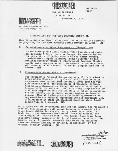 | Keywords: Preparations for the 1986 Economic Summit - NARA - 198313.jpg Scope and content General notes 198313 Local identifier President 1981-1989 Reagan National Security Council 1981 - 1989 Ronald Reagan Library NLRR 40 Presidential Drive Simi Valley CA 93065-0600 1985-11-07 Record group Collection RR-NSC Numbered National Security Policy Papers 1981 - 1989 Record group ARC 1189 National Security Decision Directives compiled 02/25/1981 - 01/19/1989 Series ARC 198166 File unit File unit ARC Variant control numbers NAIL Control Number NLS-NSC-NSDD-198 Other versions <gallery> File Preparations_for_the_1986_Economic_Summit_-_NARA_-_198313 tif tif File Preparations_for_the_1986_Economic_Summit_-_NARA_-_198313 jpg jpg </gallery> NARA-cooperation PD-USGov Presidential Decision Directives Reagan |