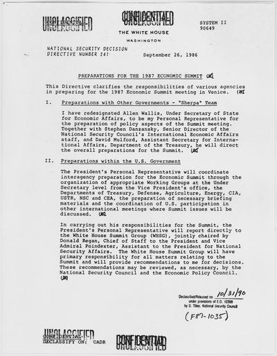 | Keywords: Preparations for the 1987 Economic Summit - NARA - 198343.tif Scope and content General notes 198343 Local identifier President 1981-1989 Reagan National Security Council 1981 - 1989 Ronald Reagan Library NLRR 40 Presidential Drive Simi Valley CA 93065-0600 1986-09-26 Record group Collection RR-NSC Numbered National Security Policy Papers 1981 - 1989 Record group ARC 1189 National Security Decision Directives compiled 02/25/1981 - 01/19/1989 Series ARC 198166 File unit File unit ARC Variant control numbers NAIL Control Number NLS-NSC-NSDD-241 yes Other versions <gallery> File Preparations_for_the_1987_Economic_Summit_-_NARA_-_198343 tif tif File Preparations_for_the_1987_Economic_Summit_-_NARA_-_198343 jpg jpg </gallery> NARA-cooperation PD-USGov Presidential Decision Directives Reagan NARA TIF images with categorized JPGs |