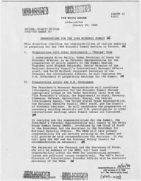 | Keywords: Preparations for the 1988 Economic Summit - NARA - 198389.jpg Scope and content General notes 198389 Local identifier President 1981-1989 Reagan National Security Council 1981 - 1989 Ronald Reagan Library NLRR 40 Presidential Drive Simi Valley CA 93065-0600 1988-01-20 Record group Collection RR-NSC Numbered National Security Policy Papers 1981 - 1989 Record group ARC 1189 National Security Decision Directives compiled 02/25/1981 - 01/19/1989 Series ARC 198166 File unit File unit ARC Variant control numbers NAIL Control Number NLS-NSC-NSDD-297 Other versions <gallery> File Preparations_for_the_1988_Economic_Summit_-_NARA_-_198389 tif tif File Preparations_for_the_1988_Economic_Summit_-_NARA_-_198389 jpg jpg </gallery> NARA-cooperation PD-USGov Presidential Decision Directives Reagan 1988 documents 14th G7 summit |