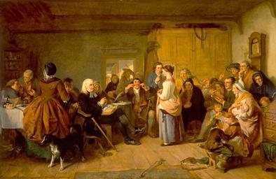 | Keywords: Presbyterian Catechising.jpg en This painting shows the minister of the local kirk questioning a young parish girl about particular aspects of her Protestant faith This practice which was used as an instructive teaching method was known as catechising Stylistically it is reminiscent of Scottish village scenes by David Wilkie but Phillips ™s treatment is more sentimental even nostalgic; the costumes are those of the previous century An unusual feature in the design is the presence of the hearthstone in the extreme bottom foreground that indicates that the spectator is standing somewhere in or even beyond the fireplace Details Acc No NG 1155 Medium Oil on canvas Size 100 60 x 156 00 cm framed 125 50 x 178 00 x 6 50 cm Credit Bequest of John Jordan 1914 1847 http //www bbc co uk/arts/yourpaintings/paintings/presbyterian-catechising-210521 Creator John Phillip PD-art-100-1923 Uploaded with UploadWizard Presbyterianism John Phillip Images from BBC Your Paintings Examinations in art |