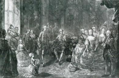 | Keywords: Presentation of the portrait of Maria Antonia of Austria (Marie Antoinette) to Louis Auguste, Dauphin of France in front of Louis XV and the court at Versailles.jpg en Presentation of the portrait of Maria Antonia of Austria Marie Antoinette to Louis Auguste Dauphin of France in front of Louis XV and the court at Versailles Jean-Baptiste André Gautier-Dagoty French 1740-1786 Présentation du portrait de Marie-Antoinette à Louis dauphin futur Louis XVI 1770 estampe conservé probablement dans le Cabinet des Estampes de la Bibliothèque Nationale Celui-ci en possedait deux exemplaires dont l'un rogné fut présentée lors d'une exposition tenue du 15 mai au 15 octobre 1906 dans les salles de la rue Vivienne A cette occasion il fut précisé M Gauthier Dagoty fils de M Gautier sic anatomiste pensionné du Roy a publié une estampe de sa composition représentant le roi Louis XV qui accompagné de la famille royale montre à Mgr le dauphin le futur Louis XVI le médaillon sic de l'auguste archiduchesse Antoinette Ce médaillon est soutenu par l'ambassadeur de l'Empire Cette composition intéressante par elle-même puisqu'elle nous retrace une union désirée l'est encore par les soins qu'a pris l'artiste de rendre ses personnages ressemblants Au bas on lit ce vers latin 'Fœdera sanguiSy hymeit nexu solidentur amori' L'estame a été grave en manière noire par l'auteur lui-même et a environ 30 pouces de long sur 24 de haut Mercure de France avril 1770 p 193 Note communiquée obligeamment par M Albert Vuaflart cité in Exposition d'Oeuvres d'Art du XVIIIe siècle à la Bibliothèque Nationale Catalogue Miniatures Gouaches Estampes en couleurs françaises et anglaises 1700-1750-1815 Médailles et Pierres gravées 1700-1800 Biscuits de Sèvres 1906 Paris Librairie Centrale des Beaux-Arts Emile Lévy Editeur 13 rue Lafayette Ouvrage paru à l'occasion de l'exposition mentionnée plus haut Jean-Baptiste André Gautier-Dagoty 1740-1786 1770 <-- à vérifier --> PD-old-100 ImageNote 1 780 399 102 213 1595 1049 2 King Louis XV ImageNoteEnd 1 ImageNote 2 574 425 54 197 1595 1049 2 Louis Auguste Dauphin of France future Louis XVI ImageNoteEnd 2 ImageNote 3 1356 407 40 128 1595 1049 2 Portrait of Maria Antonia of Austria ImageNoteEnd 3 ImageNote 4 257 606 74 183 1595 1049 2 Marie Clotilde of France future Queen of Sardinia ImageNoteEnd 4 ImageNote 5 417 712 74 263 1595 1049 2 Élisabeth of France ImageNoteEnd 5 ImageNote 6 345 429 62 114 1595 1049 2 Louis Xavier Count of Provence future Louis XVIII of France ImageNoteEnd 6 ImageNote 7 429 457 42 100 1595 1049 2 Charles Philippe Count of Artois future Charles X of France ImageNoteEnd 7 ImageNote 8 1212 530 56 225 1595 1049 2 Marie Adélaïde of France ImageNoteEnd 8 ImageNote 9 1260 353 26 84 1595 1049 2 Victoire of France ImageNoteEnd 9 ImageNote 10 1152 417 22 52 1595 1049 2 Sophie of France ImageNoteEnd 10 ImageNote 11 1097 423 26 110 1595 1049 2 Louise Marie of France ImageNoteEnd 11 ImageNote 12 933 134 152 237 1595 1049 2 Portrait of Queen Marie Leszczyńska late wife of Louis XV died 1768 ImageNoteEnd 12 ImageNote 13 1236 183 74 94 1595 1049 2 Bust of Louis XIV of France ImageNoteEnd 13 ImageNote 14 361 64 108 140 1595 1049 2 Bust of Henri IV ImageNoteEnd 14 ImageNote 15 955 30 112 36 1595 1049 2 Louis Dauphin of France and his wife ImageNoteEnd 15 Interior of the Palace of Versailles in art House of Bourbon Marie Antoinette of Austria Louis XV of France Louis XVI of France Louis XVIII of France Charles X of France Marie Clotilde of France Princess Élisabeth of France Marie Adélaïde of France Princess Victoire of France Sophie de France 1734-1782 Princess Louise-Marie of France Marie Leszczyńska Events in Versailles 1770 about Versailles in the 18th century Jean-Baptiste André Gautier-Dagoty Cabinet des Estampes BNF |