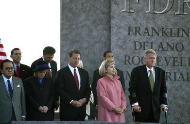 | Keywords: President Bill Clinton, First Lady Hillary Clinton, Vice President Al Gore and his wife Tipper, and U.S. Senator Daniel Inouye, right to left, at the 1997 dedication of the Franklin Delano Roosevelt LCCN2011634219.tif 1 transparency color ; 4 x 5 in or smaller Notes Title date and keywords provided by the photographer ; Digital image produced by Carol M Highsmith to represent her original film transparency; some details may differ between the film and the digital images ; Forms part of the Selects Series in the Carol M Highsmith Archive ; Gift and purchase; Carol M Highsmith; 2011; DLC/PP-2011 124 ; Credit line Photographs in the Carol M Highsmith Archive Library of Congress Prints and Photographs Division 1997 Creator Carol M Highsmith Library of Congress Catalog http //lccn loc gov/2011634219 Image download https //cdn loc gov/master/pnp/highsm/16000/16026a tif Original url http //hdl loc gov/loc pnp/highsm 16026 No known restrictions on publication LOC-image highsm 16026 PD-Highsmith Images uploaded by Fæ Photographs by Carol M Highsmith |