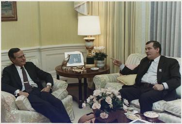 | Keywords: President Bush meets privately with Solidarity Leader Lech Walesa of Poland in the residence - NARA - 186403.tif Scope and content General notes 186403 Local identifier President 1989-1993 Bush Photograph Office 1989 - 1993 NARA-Author Valdez David 1949- Photographer 4097323 <br /> George Bush Library NLGB 1000 George Bush Drive West College Station TX 77845 1989-11-14 Record group Collection GB-WHPO Records of the White House Photograph Office 01/20/1989 - 01/20/1993 Record group ARC 1082 George H W Bush Presidential Photographs compiled 01/20/1989 - 01/20/1993 Series ARC 186364 File unit File unit ARC Variant control numbers NAIL Control Number NLB-WHPC-A-P8046 27 yes Other versions NARA-cooperation PD-USGov George H W Bush in 1989 Lech Wałęsa Photographs of sitting men Relations of Poland and the United States |