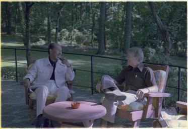 | Keywords: President of Egypt Anwar Sadat and Jimmy Carter meet at the beginning of the Camp David Summit. - NARA - 181074.tif Scope and content General notes 181074 Local identifier President 1977-1981 Carter White House Staff Photographers 01/20/1977 - 01/20/1981 Jimmy Carter Library NLJC 441 Freedom Parkway Atlanta GA 30307-1498 1978-09-06 Record group Collection JC-WHSP Carter White House Photographs Collection 01/20/1977 - 01/22/1981 Record group ARC 1120 Carter White House Photographs Presidential compiled 01/20/1977 - 01/22/1981 Series ARC 173341 File unit Camp David Summit mtg -- President Carter with President Sadat on the patio 09/06/1978 - 09/06/1978 File unit ARC 181072 Variant control numbers NAIL Control Number NLC-WHSP-C-07269-8 yes Other versions NARA-cooperation PD-USGov Jimmy Carter and Anwar Sadat Camp David Accords |
